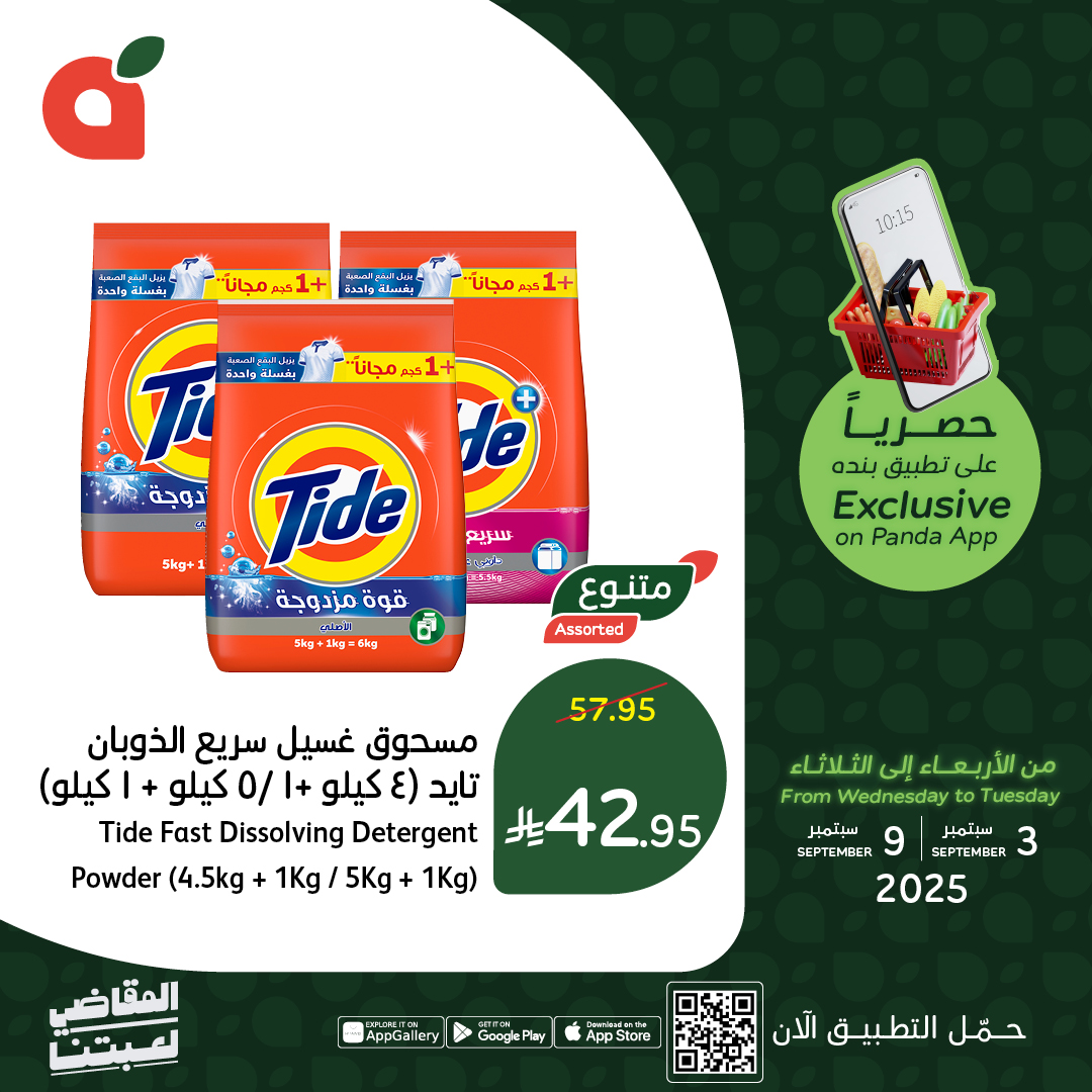 - مسحوق غسيل سريع الذوبان تايد (4.5 كجم + 1 كجم / 5 كجم + 1 كجم) – 42.95 ريال
