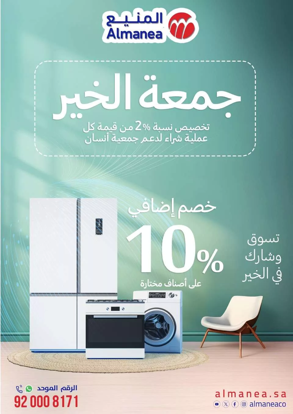 عرض المنيع يتيح للعملاء فرصة التسوق والمساهمة في الخير حيث يتم تخصيص نسبة 2% من قيمة كل عملية شراء لدعم جمعية إنسان استمتعوا بالتخفيضات الكبيرة على الأجهزة اللوحية و الأجهزة الصوتية ومشتركات الكهرباء بالإضافة إلى خصومات خاصة على ملحقات الهواتف الذكية