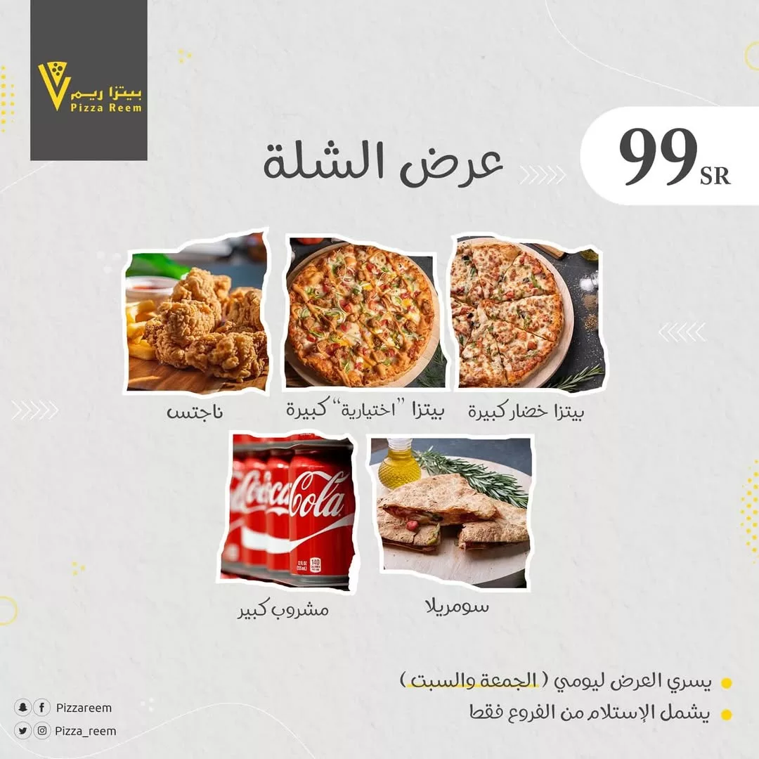 تقدم لكم Pizza Reem – بيتزا ريم عرض مميز على الشلة بـ ٩٩ ريال بس بيتزا خضار كبيرة و بيتزا “اختيارية” كبيرة و سومريلا لذيذ و ناجتس مقرمش و مشروب كبير كل هذا ضمن العرض يسري ليومي الجمعه و السبت 20 و 21 سبمتبر الاستلام من الفروع فقط