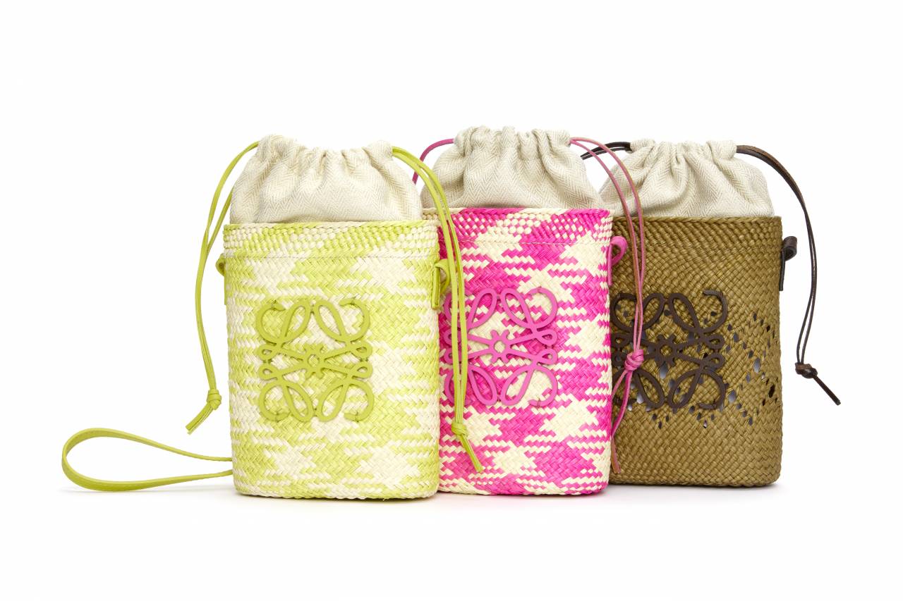 وتبرز ضمن تشكيلة الحقائب حقيبتا العلامتين Puzze وpuzzle Fold بحجم كبير على شكل سلال بتصميم جديد مصنوع من ألياف نخيل الرافيا المنسوجة، كما تأتي حقيبتا Font كبيرتا الحجم Iraca Basket بمجموعة من الألوان الجديدة. ويتألق إصدار Puzza المنسوج من الرافيا برسومات مخطّطة تتناغم مع قصّات الحقيبة، ما يمنحها تصميماً فريداً متنوع الألوان والنقشات والأنماط. تشكّل التصاميم الجلدية الصيحة الرائجة لهذا الموسم، وتقدّم التشكيلة حقيبة Flamenco Bucket المناسِبة لمختلف الأوقات بفضل تصميمها المبتكَر من جلد النابا الفاخر والمزيّن بالثنيات. وتتزيّن الحقائب الصغيرة والأخرى المميزة من الجلد بنقشات على هيئة فواكه ومزيج من نسيج الرافيا، إلى جانب الحقائب الصغيرة من الجلد، المستوحاة كلها من عالم الحيوان وتصاميم المَحافظ والتعليقات التي تتناغم مع لمسات LOEWE المفعمة بالمرح والحيوية. وتأتي تشكيلة الحقائب مع خيارات واسعة من تعليقات دبابيس الزينة الملوّنة على شكل حيوانات، لتضيف مزيداً من اللمسات الخاصة إلى الإطلالة.