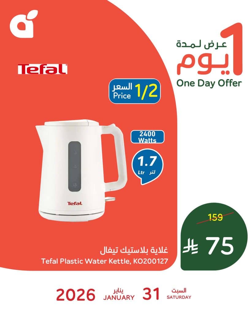 عروض بنده السعودية السبت 31 يناير 2026 الموافق 11 شعبان 1447هـ و تحتوي علي افضل الاجهزة المنزلية و الضرورية منها غلاية بلاستيك تيفال و ايضا بتوفر اقوي الادوات المنزلية من قدر الضغط السيف في عرض حصري متاح اليوم فقط و بنصف السعر لا تفوت الفرصة و تسوق عروض بنده اليوم ووفر .