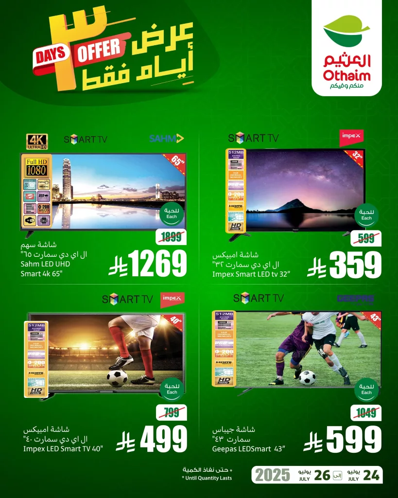 عروض العثيم الخميس 24 يوليو 2025 تقدم باقة مميزة من الشاشات الذكية بمقاسات متنوعة من علامات تجارية معروفة لفترة محدودة و تشمل أيضا تشكيلة واسعة من الأجهزة المنزلية الصغيرة وأدوات المطبخ مثل صانعات القهوة والخلاطات والمكاوي والمحامص والعصارات بالإضافة إلى أطقم أواني الطهي والترامس باقل الاسعار