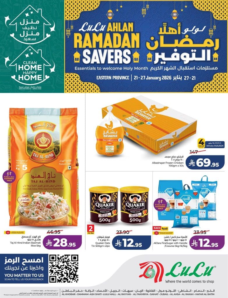 عروض لولو المنطقة الشرقية الأربعاء 21-1-2026 الموافق 2 شعبان 1447هـ و تحتوي على بيض المزارع وزيت دوار الشمس العضوي وأكياس الأرز المصري طويل الحبة وحلاوة طحينية بالفستق وتونة بالزيت النباتي والذرة الحلوة و بتوفر كمان أجهزة منزلية متميزة منها فرن تحميص بشواية ومحمصة خبز عريضة وشواية فحم متنقلة وسخان مياه