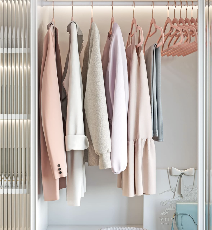هذا هو السر التنظيمي المفضل لدي لمشاركته – الشماعات المخملية. إنها تستحق الاستثمار، فهي تحافظ على ملابسك من الانزلاق على الأرض والارتطام بحذائك، بالإضافة إلى أن شكلها النحيف يجعلها حلمًا موفرًا للمساحة (وسوف توفر عليك من المصارعة مع البلاستيك الضخم أو الشماعات السلكية الرخيصة من منظفك الجاف) . مجموعة مطابقة مثل هذه ستجعل خزانة ملابسك تبدو أنيقة مثل متجر متعدد الأقسام. بالإضافة إلى ذلك، فهي جميلة… وهي تدور! وفر أكثر من 50% مع القسيمة.
