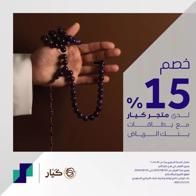 يقدم لكم بنك الرياض عرض خاص وفيه خصم 15% لدى “متجر كيار” باستخدام بطاقات بنك الرياض
