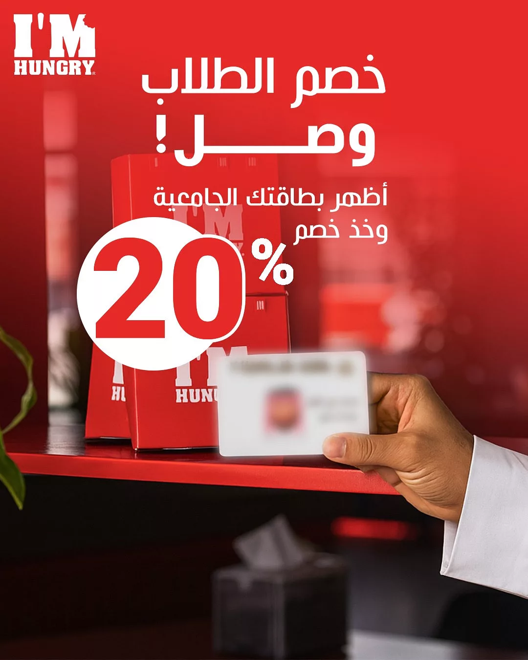 احصلوا على خصم 20 % من مطعم اي ام هنجري للطلاب الجامعيين 19 اكتوبر 2025 عند الطلب ابرز البطاقة الجامعية و استفيد من الخصم