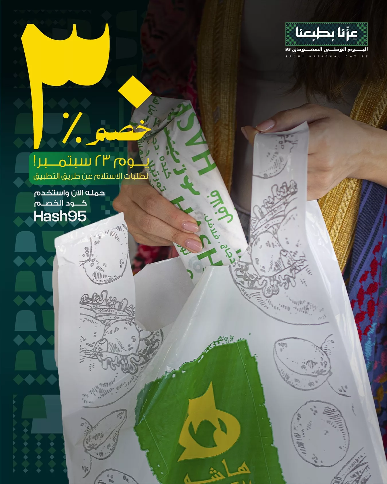 مطاعم هاشم تقدم لكم خصم 30% بمناسبة اليوم الوطني السعودي 95 في يوم الثلاثاء 23 سبتمبر 2025