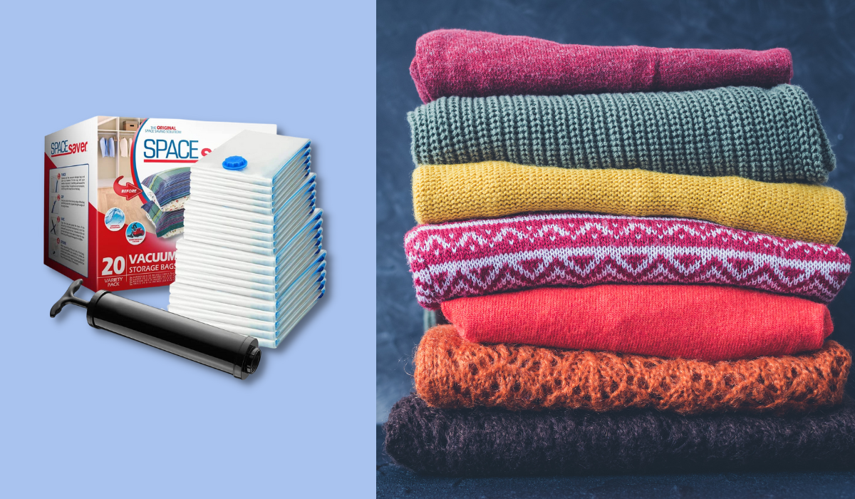 كيف تعمل أكياس تخزين Spacesaver؟ يمكنك ببساطة تحميلها بكل ما تريد تخزينه، ثم قم بتمرير المشبك عبر الجزء العلوي لإنشاء قفل بسحاب مزدوج، ثم قم بتوصيل فوهة المكنسة الكهربائية الخاصة بك بالمنفذ البلاستيكي، وامتص كل الهواء الزائد. النتيجة: أصبحت كومة الملابس أو الفراش الضخمة وغير العملية أصغر بنسبة تصل إلى 80%.