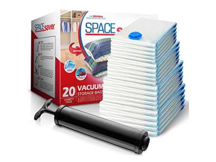 كيف تعمل أكياس تخزين Spacesaver؟ يمكنك ببساطة تحميلها بكل ما تريد تخزينه، ثم قم بتمرير المشبك عبر الجزء العلوي لإنشاء قفل بسحاب مزدوج، ثم قم بتوصيل فوهة المكنسة الكهربائية الخاصة بك بالمنفذ البلاستيكي، وامتص كل الهواء الزائد. النتيجة: أصبحت كومة الملابس أو الفراش الضخمة وغير العملية أصغر بنسبة تصل إلى 80%.