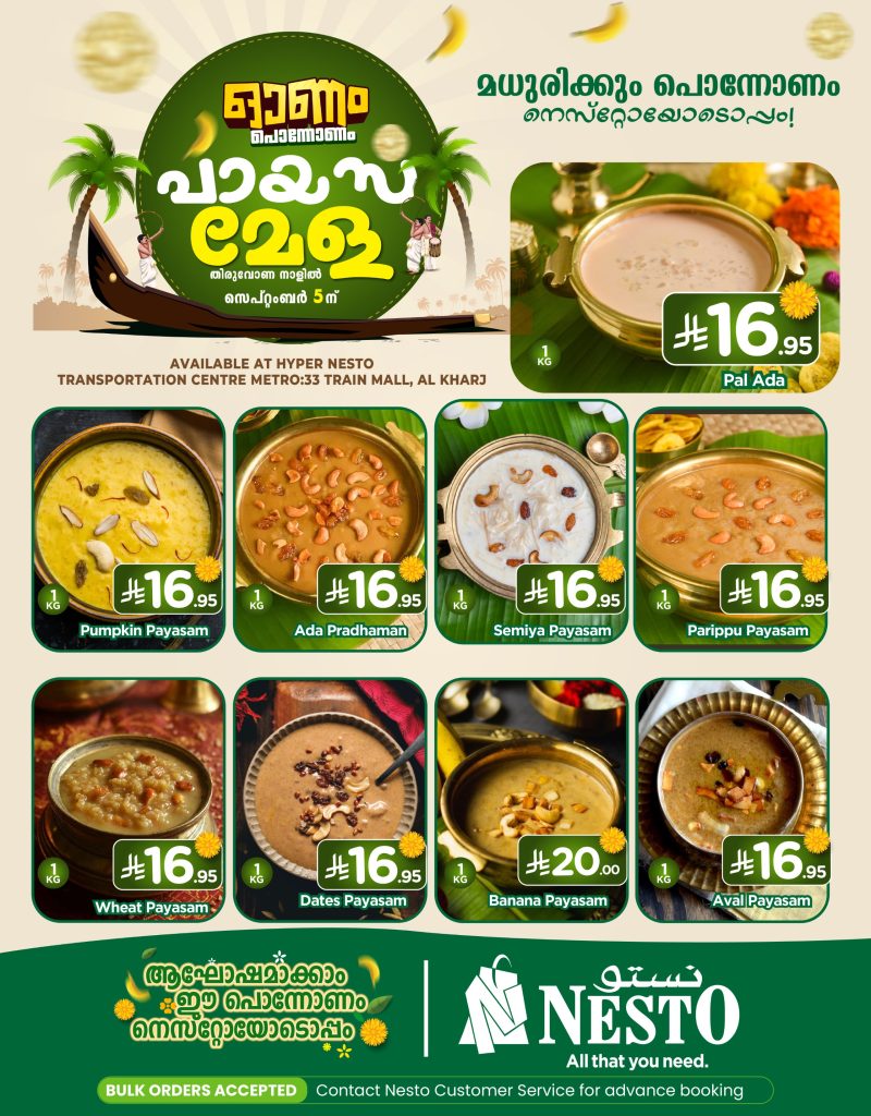 في فرع نستو هايبر ماركت العزيزية – مركز المواصلات (مترو 33) في الخرج، ينتظركم عرض أونام باياسميلا الذي يجمع أشهى أطباق الـ Payasam التقليدية بنكهات متعددة وبأسعار مميزة، لتناسب مختلف الأذواق