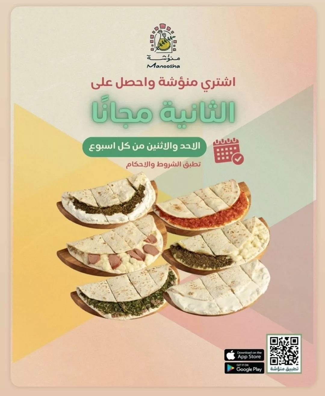 عرض الأحد والاثنين مطعم منؤشة 12-13 اكتوبر 2025 اشتري منؤشة و احصل على الثانية مجانا و استمتع بأفضل وجبة