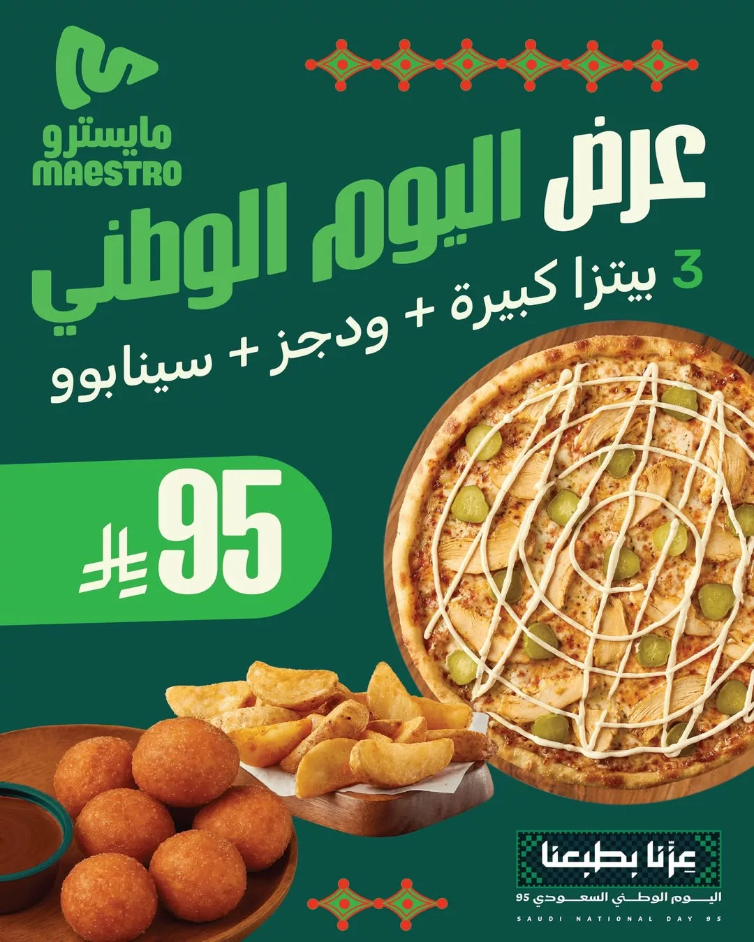 عرض اليوم الوطني السعودي 95 ضمن مطعم مايسترو بيتزا وفيه 3 بيتزا كبيرة +ودجز + سينابوو بسعر 95 ريال فقط