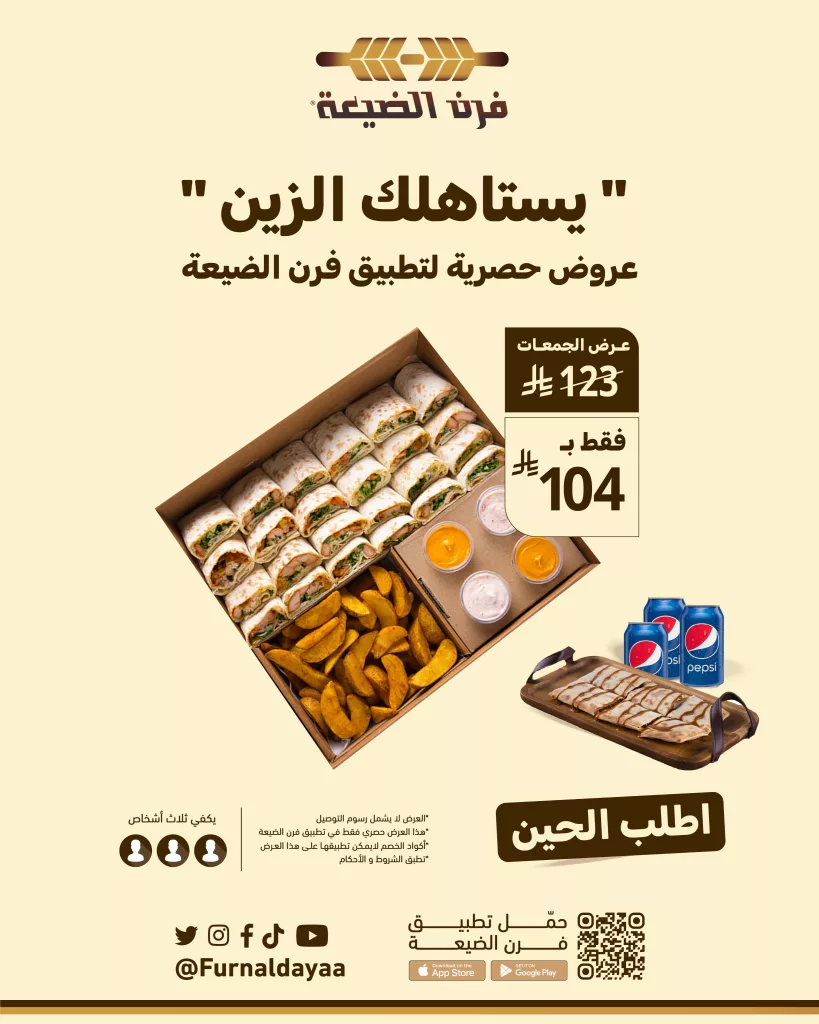 استمتع بعرض “يستاهلك الزين” الحصري من فرن الضيعة، المتاح فقط عبر تطبيقهم الإلكتروني، والذي يوفر لك بوكس فاخر يكفي لـ 3 أشخاص ويجمع بين الطعم، التنوع، والتوفير