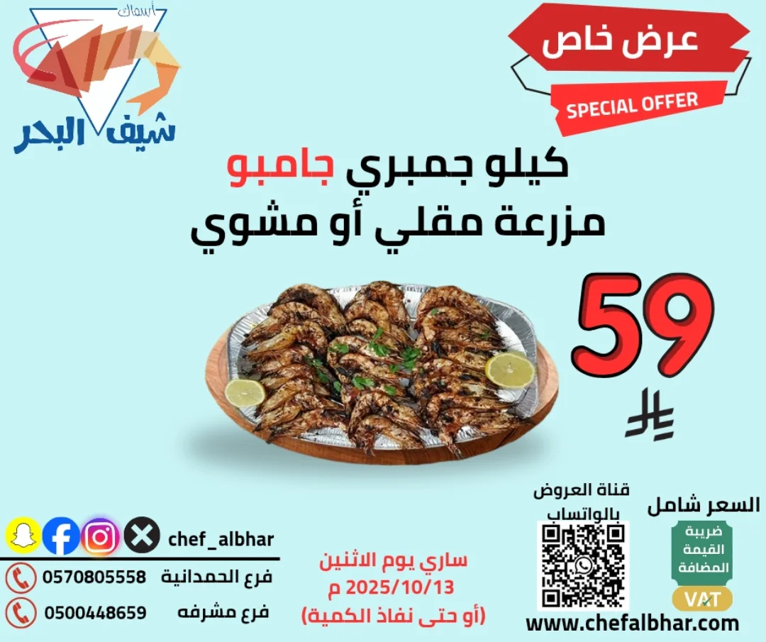 عرض مطعم اسماك شيف البحر الخاص على جمبري جامبو مقلي او مشوي بسعر مميز الاثنين 13 اكتوبر 2025