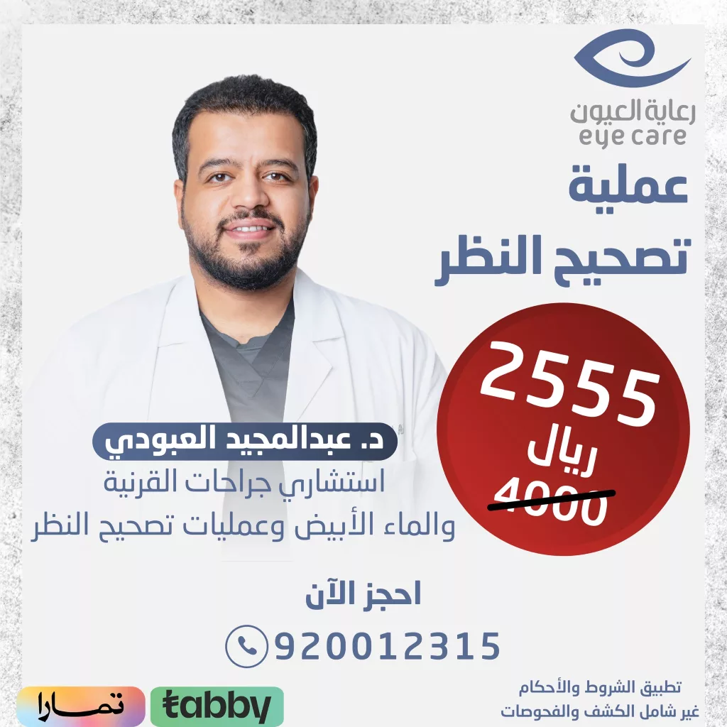 يقدم مركز رعاية العيون عرضًا حصريًا على عملية تصحيح النظر بالتعاون مع الدكتور عبدالمجيد العبودي، استشاري جراحات القرنية والماء الأبيض وتصحيح النظر، وذلك بسعر مميز 2555 ريال فقط بدلًا من 4000 ريال. العرض يشمل حزمة متكاملة من الخدمات والمزايا التي تضيف للعميل قيمة حقيقية وعناية استثنائية