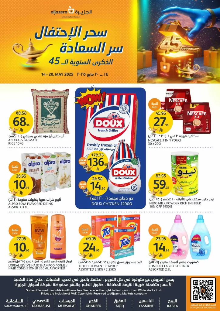 عروض أسواق الجزيرة الأسبوعية الأربعاء 14 مايو 2025 تبدأ بتخفيضات كبيرة على الجبن القريش والزبادي بالفواكه والعصائر الطازجة بالإضافة إلى المعلبات الجاهزة مثل الفول والحمص والعدس والصلصات الخاصة بالمعكرونة كما تشمل عروضاً على الدقيق الأبيض والسكر والفواكه الطازجة مثل التفاح والكيوي والعنب