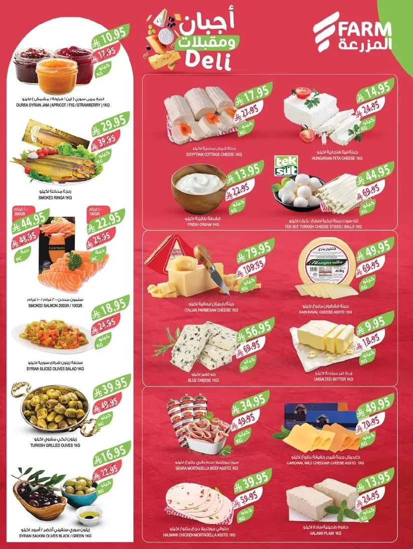 كما تقدم أسواق المزرعة تخفيضات لافتة على الخضروات الطازجة مثل الباذنجان والفاصوليا والطماطم المحلية بالإضافة إلى الفواكه المستوردة مثل الكرز والعنب الأحمر والتفاح الأخضر وتشمل العروض أيضًا العصائر الطازجة والمشروبات الباردة بأحجام متعددة وتتوفر خصومات على المعكرونة الجافة وصلصة الباستا الجاهزة