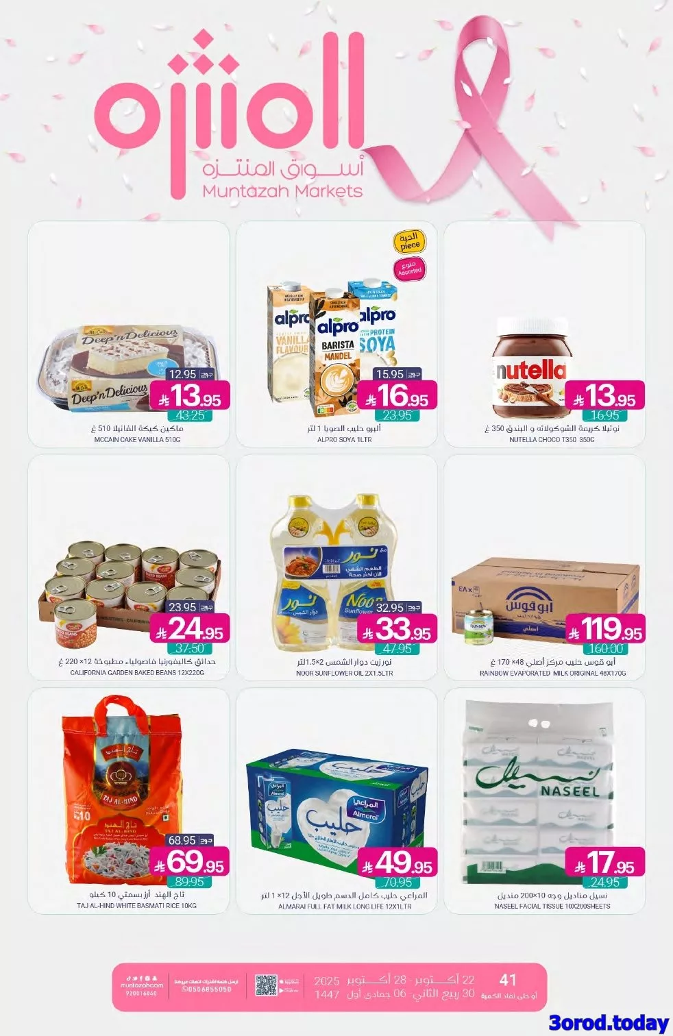 عروض أسواق المنتزه الأسبوعية الأربعاء 22 أكتوبر 2025 تشمل مجموعة من الأغذية الطازجة من المخبوزات والمعجنات الشرقية والحلويات والعصائر الطبيعية والفواكه والخضروات الموسمية والعسل الطبيعي والمشروبات الباردة كما تضم خصومات على الأجهزة الصغيرة وأجهزة التحضير و الخلاطات و مواقد الغاز