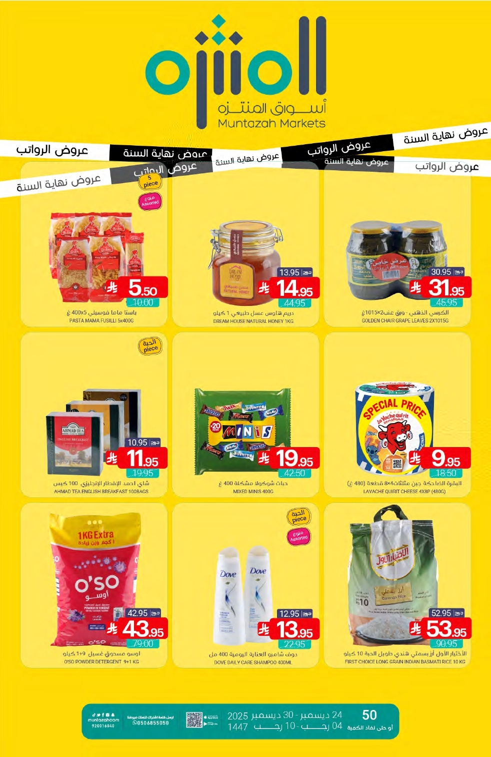 عروض أسواق المنتزه الخميس 25-12-2025 تبدأ بالأجهزة الكهربائية المنزلية مثل مكواة ملابس وساعة حائط وسماعة بلوتوث ولمبة ليد ومشترك كهرباء ثم تضم المواد الاستهلاكية التي تشمل حليب طويل الأجل وعصائر فواكه ومياه شرب وشاي أسود وقهوة ورقائق بطاطس متنوعة وحلويات وغيرها من المنتجات باسعار مناسبة في صفقات نهاية العام