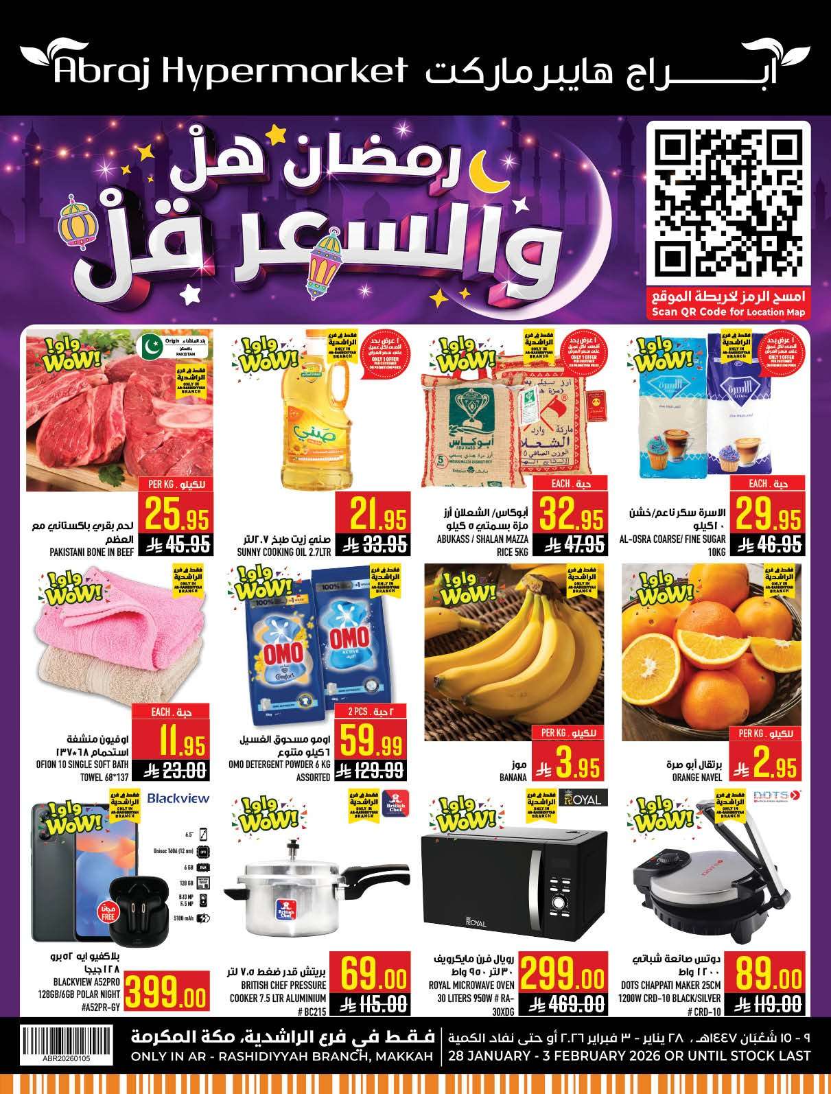 عروض ابراج هايبر ماركت الاسبوعية الاربعاء 28-1-2026 الموافق 9 شعبان 1447هـ و تحتوي علي شمل تخفيضات على لحم بقري مفروم وحاشي محلي وستيك برازيلي ولحم جمل وعجل طازج وكفتة وبرجر وخروف سواكني مع تشكيلة واسعة من الخضروات والفواكه مثل البطاطس والطماطم والجزر والمانجو والأفوكادو والتفاح والبرتقال والأناناس