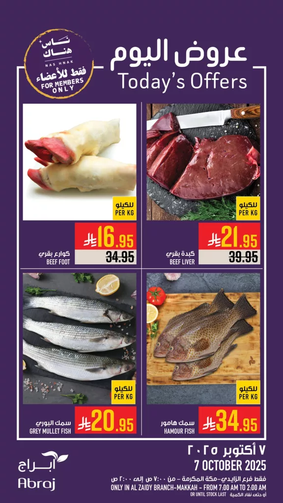 عروض أبراج هايبر ماركت الثلاثاء 6 أكتوبر 2025 تقدم اليوم تشكيلة واسعة من اللحوم الطازجة ومنتجات البحر مثل كوارع بقري وكبدة بقري وسمك البوري وسمك هامور بالإضافة إلى خيارات فريدة من الأجبان مثل جبنة جودة مع الكمون وسلطة المرتديلا المشكلة وأنواع صحية من المكسرات والشوكولاتة الملونة باقل الاسعار