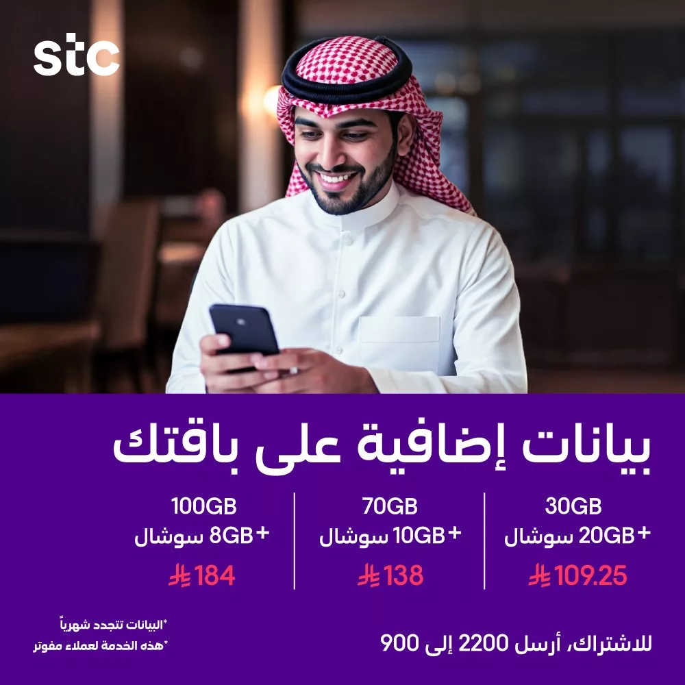 - سعر باقة 100 جيجا + 8 جيجا سوشال بـ 184 ريال سعودي