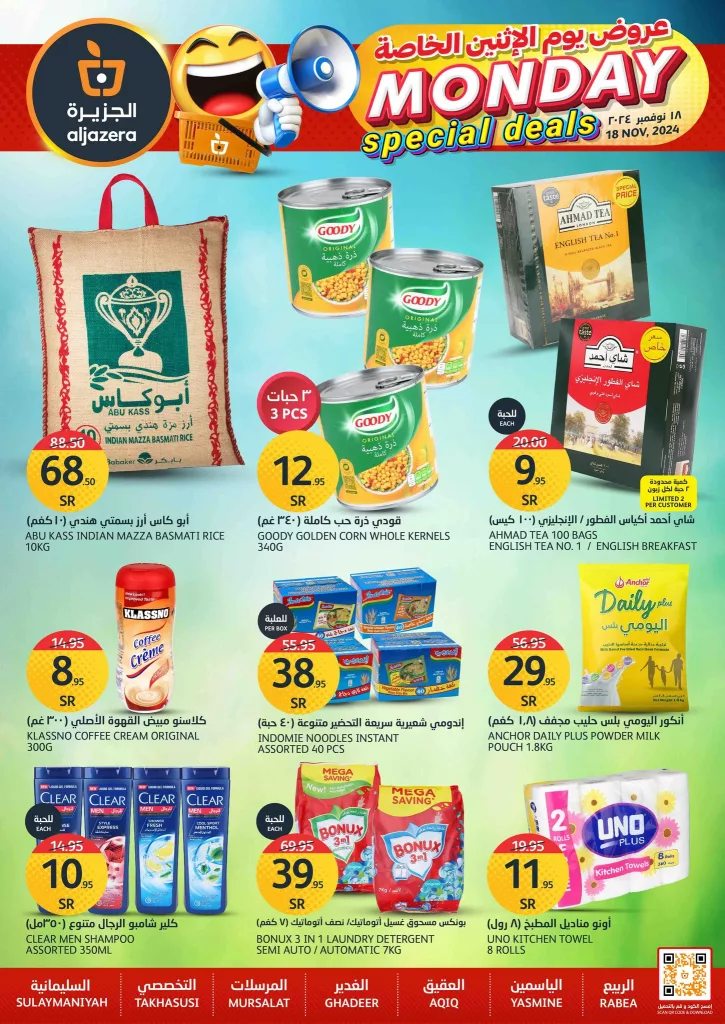 عروض أسواق الجزيرة الاثنين 18 نوفمبر 2024 تقدم مزيجا مميزا من الخصومات على مجموعة واسعة من المنتجات التي تلبي احتياجات الأسرة اليومية و تشمل العروض تخفيضات هائلة على المواد الغذائية الأساسية مثل الأرز والذرة المعلبة والشاي بالإضافة إلى منتجات الألبان مثل الحليب المجفف.