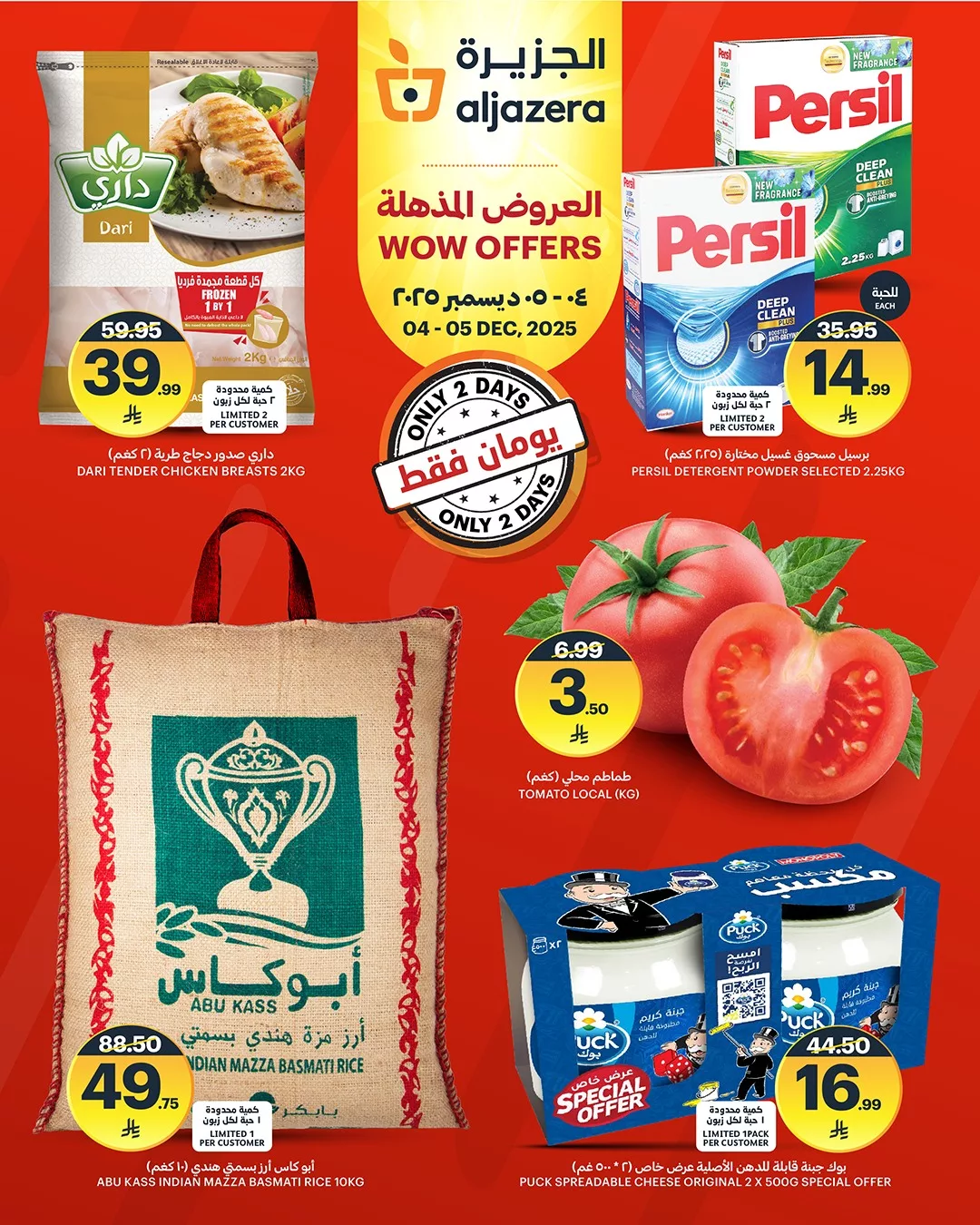 نقدم لكم احدث عروض اسواق الجزيرة الخميس 4 ديسمبر 2025 و تحتوي علي تشكيلة من منتجات متنوعة في عروض مذهلة تستمر لمدة يومان فقط منها برسيل مسحوق غسيل و داري صدور دجاج و طماطم محلي و بتوفر كمان ابو كاس ارز بسمتي و باقل الاسعار المناسبة للجميع مع تغطية حصرية لـ عروض العثيم تابعونا ليصلكم كل جديد .