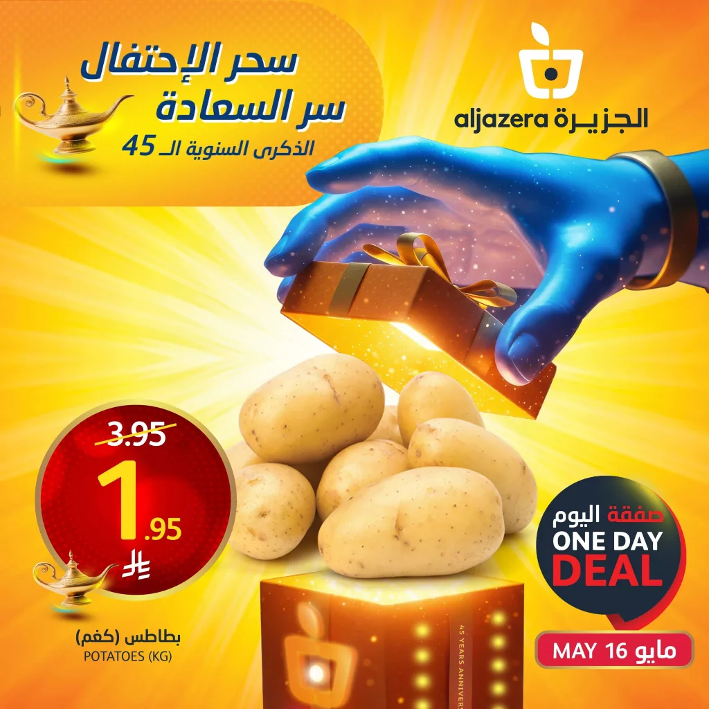 عروض أسواق الجزيرة الجمعة 16 مايو 2025 احتفالا بالذكرى السنوية الخامسة والأربعين تشمل مجموعة متنوعة من المنتجات الأساسية والعائلية بأسعار منافسة جدًا العرض يضم خيارات من الخضروات الطازجة مثل البطاطس التي تعد من أكثر السلع استخدامًا في كل منزل