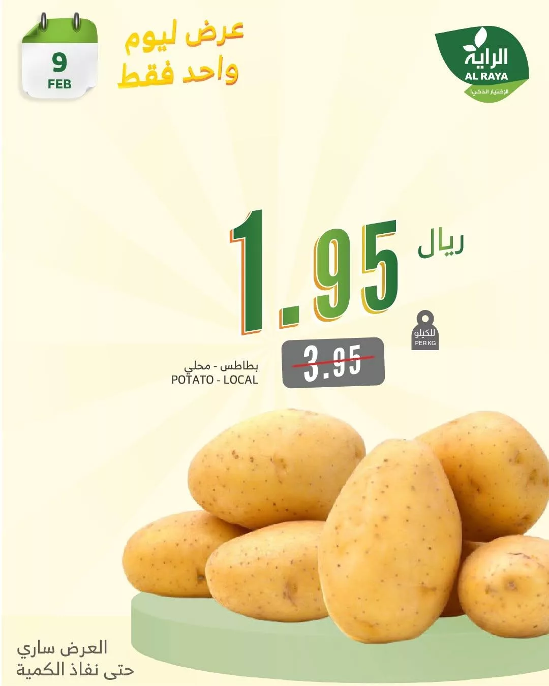 عروض أسواق الراية الأحد 9 فبراير 2025 توفر لك الفرصة المثالية لتسوق المنتجات الأساسية بأسعار مميزة و تشمل العروض الخضروات الطازجة مثل البطاطس المحلية والتي تعتبر خيارا مثاليا لإعداد وجبات صحية ومغذية و استفد من الأسعار المخفضة للحصول على أجود أنواع الخضروات الطازجة التي تحتاجها يوميا في مطبخك.