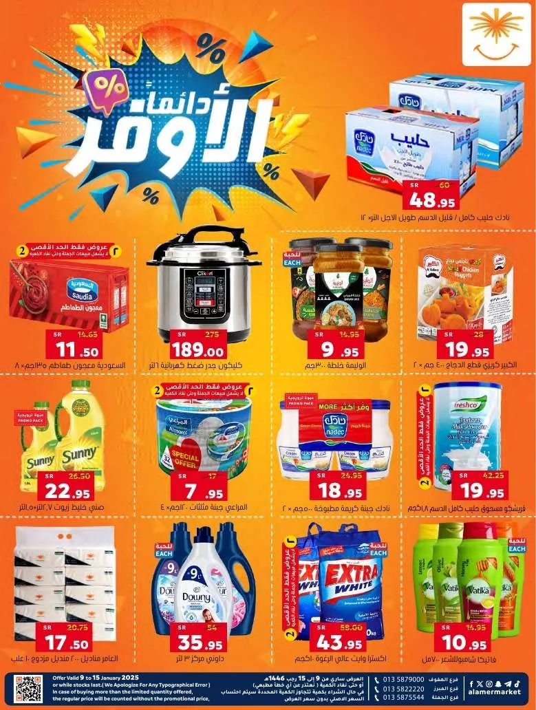 عروض أسواق العامر تقدم مجموعة مذهلة من الخصومات على مجموعة متنوعة من المنتجات التي تلبي احتياجات العائلات السعودية و تشمل هذه العروض منتجات الألبان الأساسية مثل الحليب الطازج واللبن بالإضافة إلى العصائر المختلفة التي تضيف لمسة من الانتعاش إلى يومك وبأسعارها المخفضة