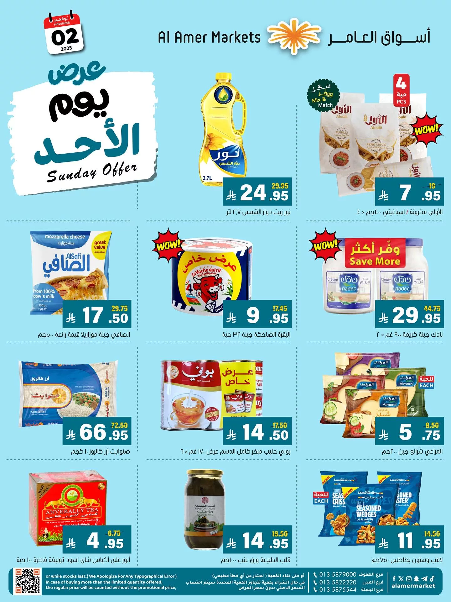 نستعرض معاكم اليوم احدث عروض اسواق العامر بتاريخ 2-11-2025 و تقدم مجموعة متنوعة من المنتجات الغذائية الأساسية حيث تشمل الجبن الموزاريلا من الصافي وحليب بوك المكثف الكامل الدسم وزيت نور دوار الشمس ومكرونة أنوا بأنواعها والأرز كالروز والشاي أنفرالي واللبنة باقل الاسعار المناسبة للجميع