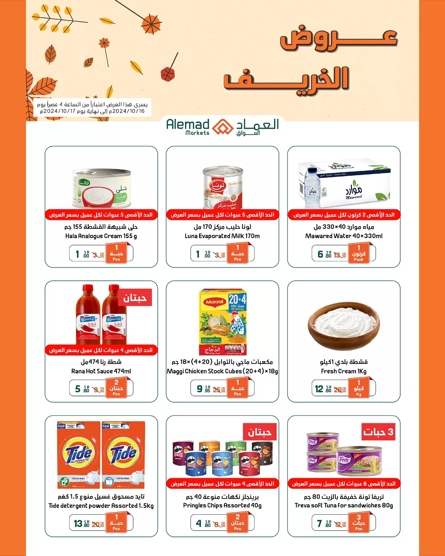 تقدم أسواق العماد يوم الأحد 27 أكتوبر 2024 عروضا مميزة تتضمن تشكيلة واسعة من المنتجات الغذائية الأساسية والمخبوزات الطازجة بالإضافة إلى قسم خاص بالخضروات والفواكه التي تأتي بأفضل الأسعار لتلبية احتياجات العملاء اليومية و يتميز العرض بتوفير منتجات عالية الجودة بأسعار تنافسية تلائم مختلف ميزانيات العملاء