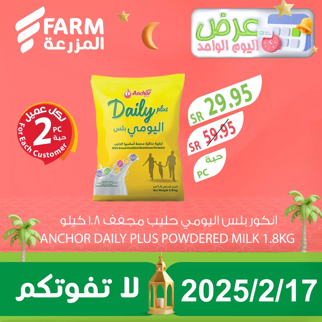 عروض أسواق المزرعة الاثنين 17 فبراير 2025 تقدم مجموعة رائعة من العروض الحصرية لهذا اليوم المميز حيث يمكن للعملاء الاستفادة من تخفيضات كبيرة على مجموعة واسعة من المنتجات الأساسية سواء كنت تبحث عن مياه الشرب الصحية أو الأرز البرياني الهندي الفاخر فإن هذه العروض تلبي احتياجاتك بأسعار لا تقاوم.