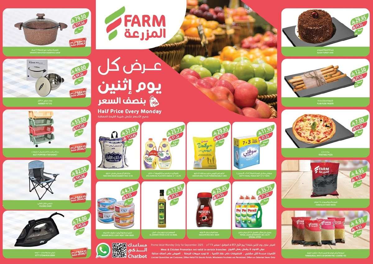عروض أسواق المزرعة المنطقة الشرقية الاثنين 1 سبتمبر 2025 تشمل تشكيلة واسعة من المنتجات المنزلية والمطبخية التي تلبي احتياجات الأسرة العصرية مثل القدور والأجهزة الكهربائية والكراسي متعددة الاستخدام و تقدم أيضا باقة مميزة من المنتجات الغذائية اليومية التي يحتاجها كل بيت مثل الأرز والحليب المجفف