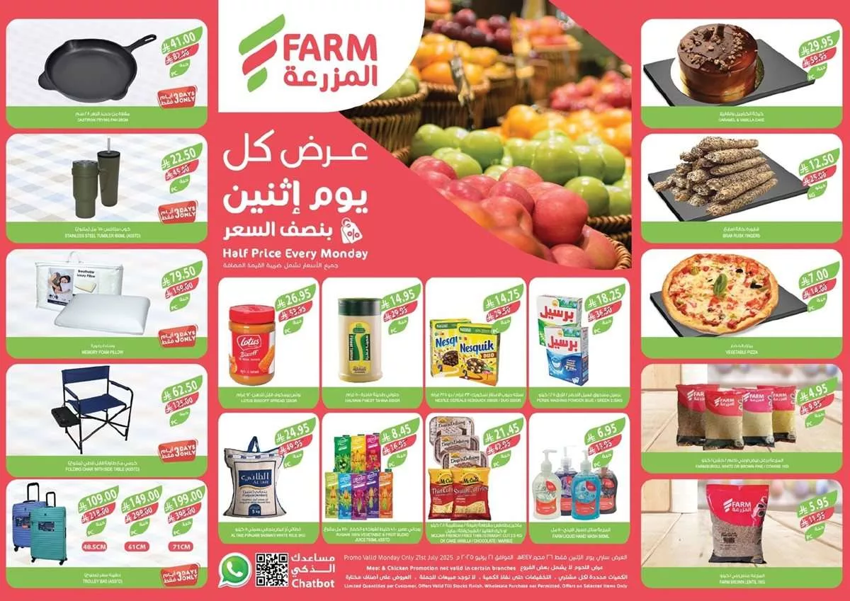 عروض أسواق المزرعة المنطقة الغربية الاثنين 21 يوليو 2025 تتنوع التخفيضات لتشمل المنتجات الغذائية والحلويات حيث نجد عروضًا مميزة على الشوكولاتة والكيك والبيتزا الجاهزة إضافة إلى الحبوب ووجبات الإفطار السريعة كما تشمل العروض تشكيلة من البقوليات والمعكرونة والمشروبات سريعة التحضير