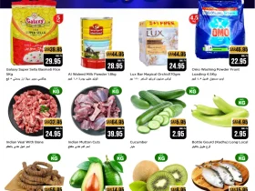 استمتعوا أيضا بتخفيضات كبيرة على المنتجات الغذائية الأساسية مثل الأرز و الزيوت والعسل بالإضافة إلى العروض المميزة على التونة و معجون الطماطم وحبوب الإفطار ولا تفوتوا الفرصة للحصول على أجود أنواع الخضروات والفواكه الطازجة بأقل الأسعار مع عروض مذهلة على المنظفات لضمان نظافة منزلكم بكل سهولة