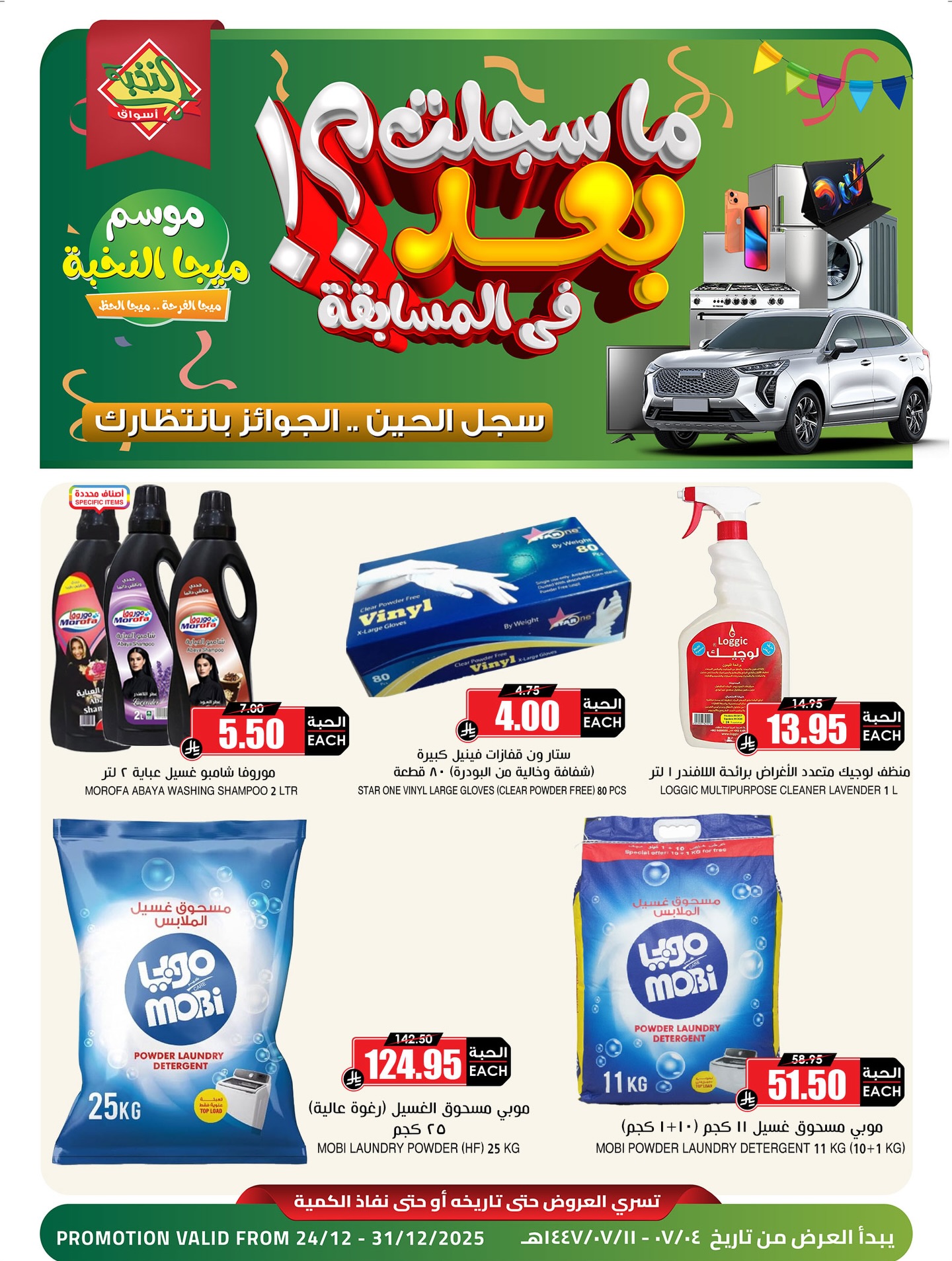 نقدم لكم احدث عروض اسواق النخبة الاربعاء 24 ديسمبر 2025 و تحتوي علي منظفات الغسيل بمختلف الأحجام ومعها مسحوق مخصص للملابس ومنظف بالإضافة إلى قفازات بجانب مناديل مبللة للأطفال ومعقمات ومنظفات أسطح ومعقمات للأيدي بالاضافة الي مجموعة من منتجات العناية بالطفل مثل شامبو الأطفال وغسول الجسم