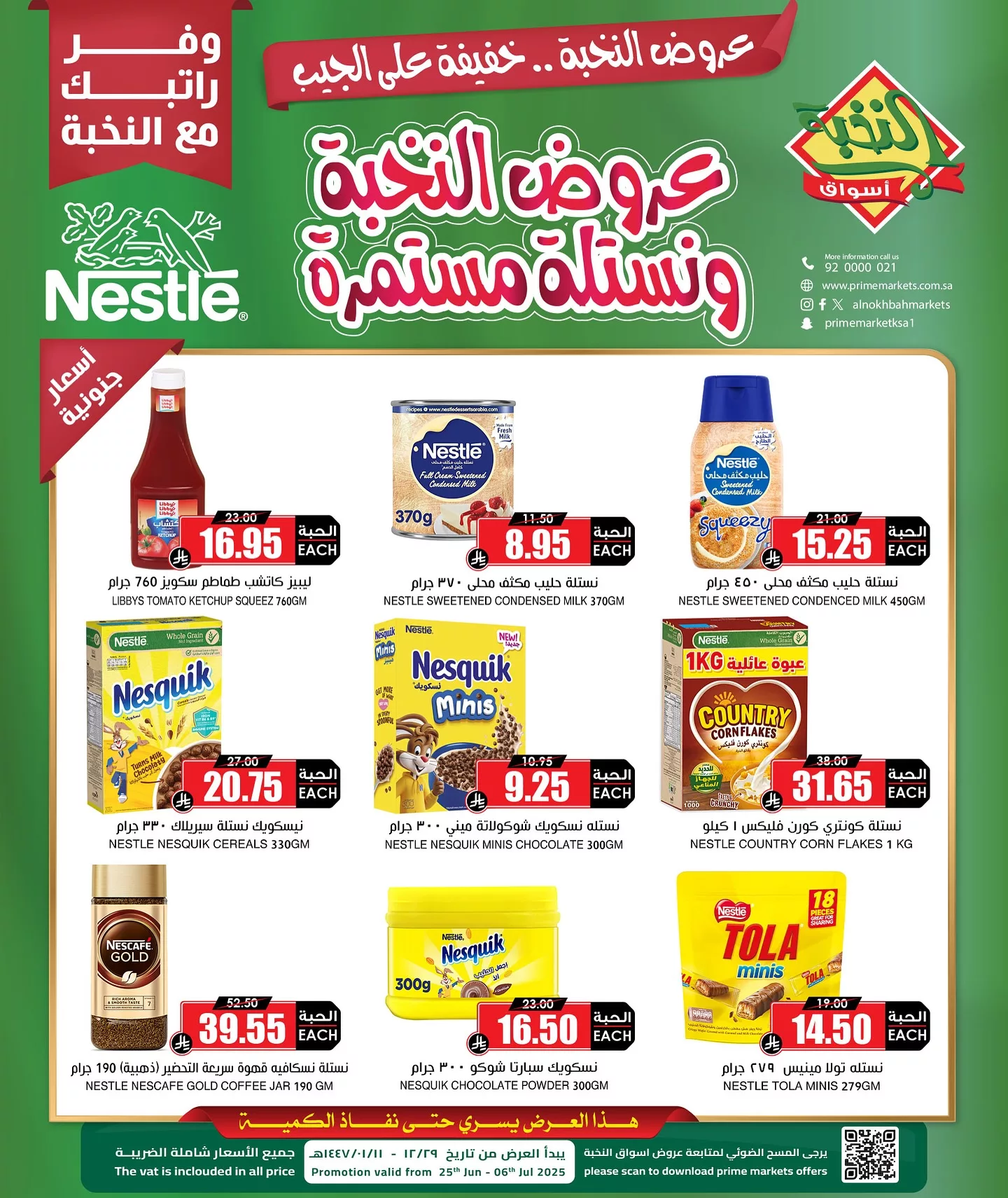 عروض أسواق النخبة تتنوع لتشمل منتجات نستله المحببة مثل نسكافيه بجميع أنواعه وكيت كات سيريال ونسكويك شوكولاتة وسيريال للأطفال في عبوات اقتصادية تناسب كل أفراد الأسرة وتشمل أيضًا مبيض القهوة والحليب المكثف والكورن فليكس ومجموعة من منتجات ماجي التي لا غنى عنها