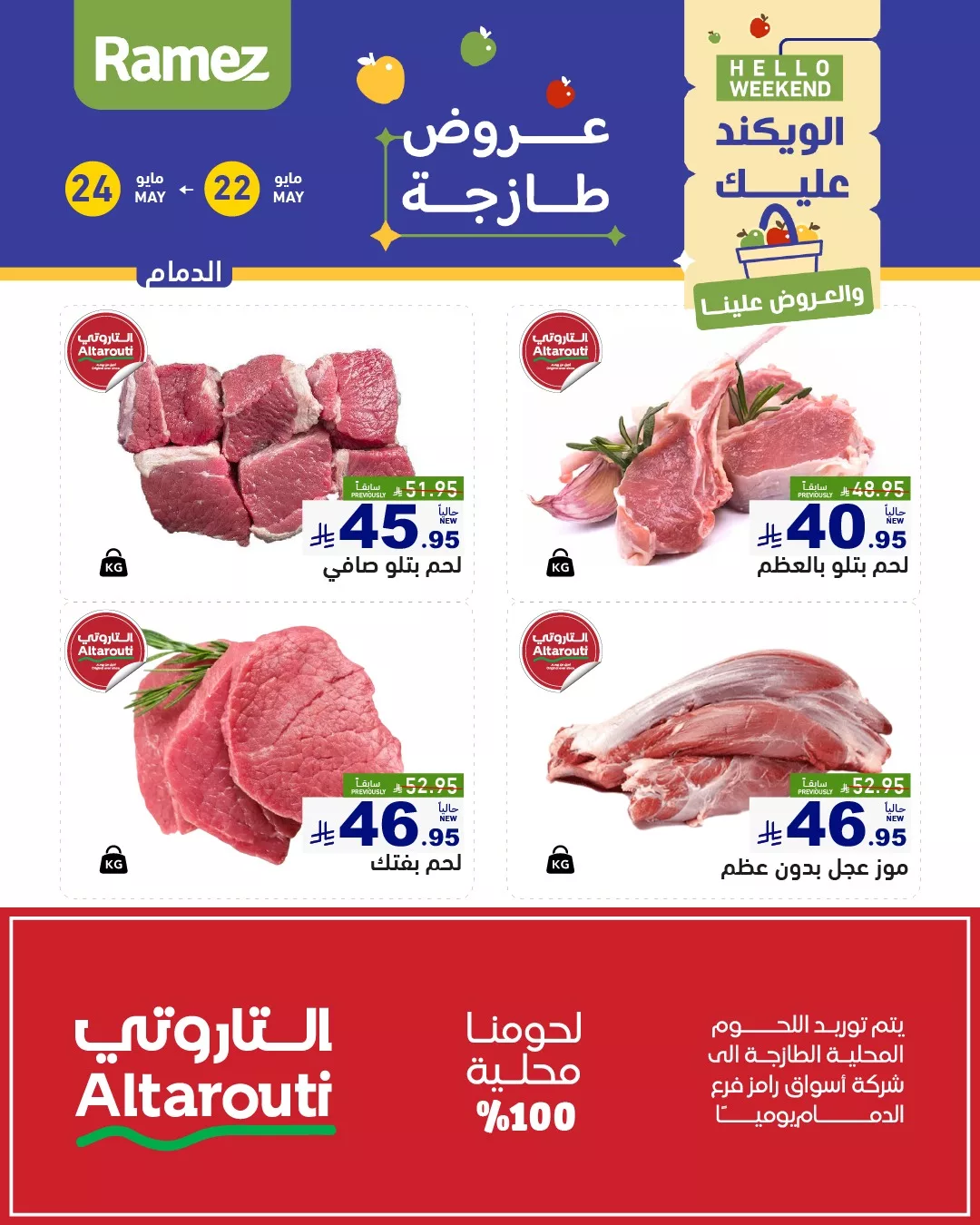 عروض أسواق رامز السعودية الخميس 22 مايو 2025 تقدم تشكيلة مميزة من اللحوم الطازجة التي تناسب كافة الأذواق حيث تتنوع بين لحم العجل المفروم ولحم الغنم والكبدة بأنواعها بالإضافة إلى ريش الغنم وكباب الدجاج واللحم بتلو بالعظم مما يجعلها وجهة مثالية لعشاق اللحوم كما تشمل العروض منتجات محلية 100٪