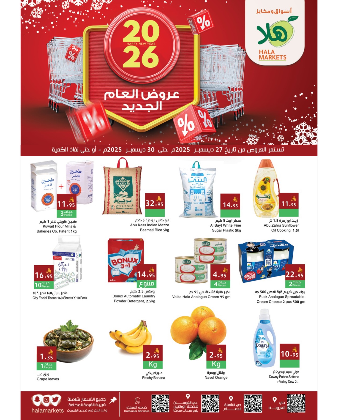 عروض اسواق و مخابز هلا الطازج الاحد 8 رجب 1447هـ و بتحتوي علي حليب البودرة والسكر الأبيض والأرز البسمتي وزيت الطبخ إلى جانب الحليب السائل والدجاج المجمد والموز والبرتقال واليوسفي والفاصوليا الخضراء والباذنجان والبطاطس والطماطم والفلفل والملفوف وغيرها من المنتجات و باقل الاسعار المناسبة للجميع