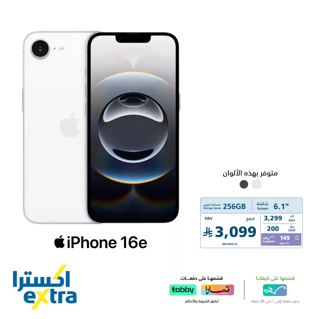- iPhone 16e – سعة 256GB – شاشة 6.1 إنش – 3,099 ريال (بدلاً من 3,299)