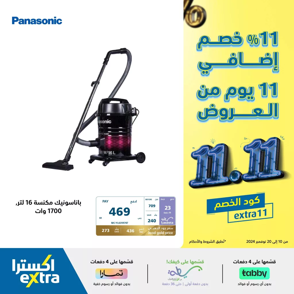 تقدم اكسترا السعودية مجموعة متميزة من العروض بمناسبة مهرجان 11.11 حيث يمكن للعملاء الاستفادة من خصم إضافي بنسبة 11% على مجموعة من المنتجات المختارة و هذا العرض الرائع يشمل تشكيلة واسعة من الأجهزة المنزلية وأجهزة العناية الشخصية التي تقدمها علامات تجارية موثوقة مثل فيليبس وباناسونيك