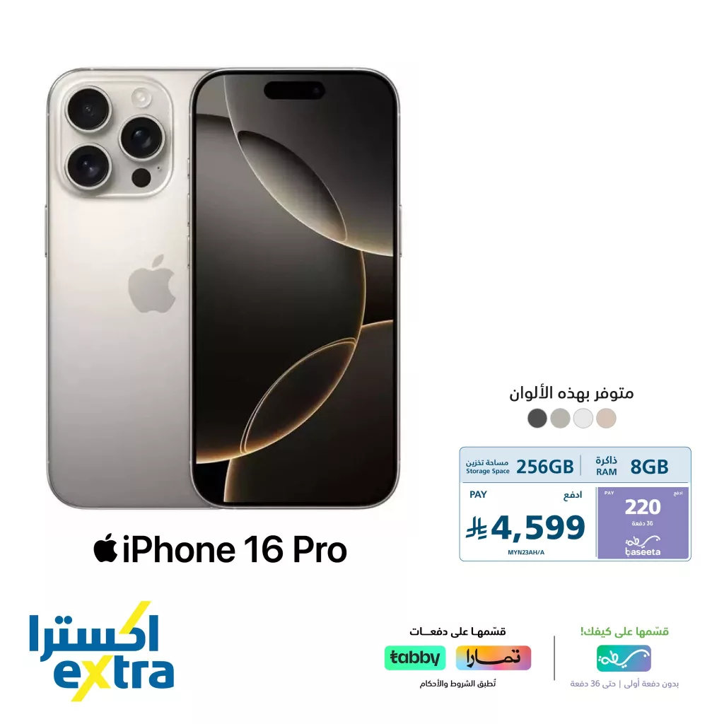 - آيفون 16 برو بسعة 256 جيجابايت وذاكرة عشوائية 8 جيجابايت – السعر: 4,599 ريال سعودي