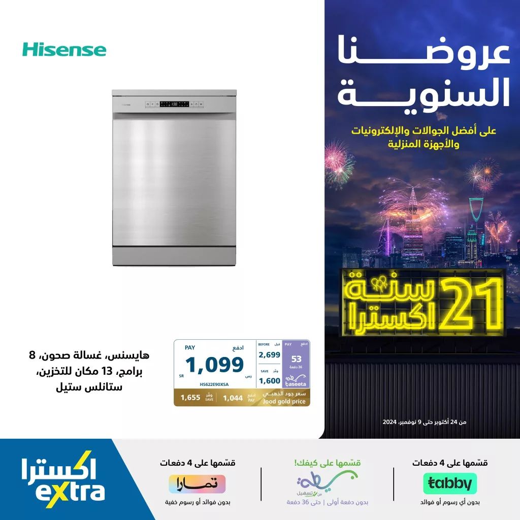 تقدم عروض اكسترا السعودية خصومات مميزة تشمل مجموعة واسعة من الأجهزة المنزلية والإلكترونيات حيث تتضمن تشكيلة العروض الحالية منتجات من علامة هايسنس الرائدة التي تتميز بتصاميم حديثة وكفاءة عالية في الاستخدام و تتيح هذه العروض فرصة للعملاء لاقتناء الأجهزة التي يحتاجونها بأسعار منافسة