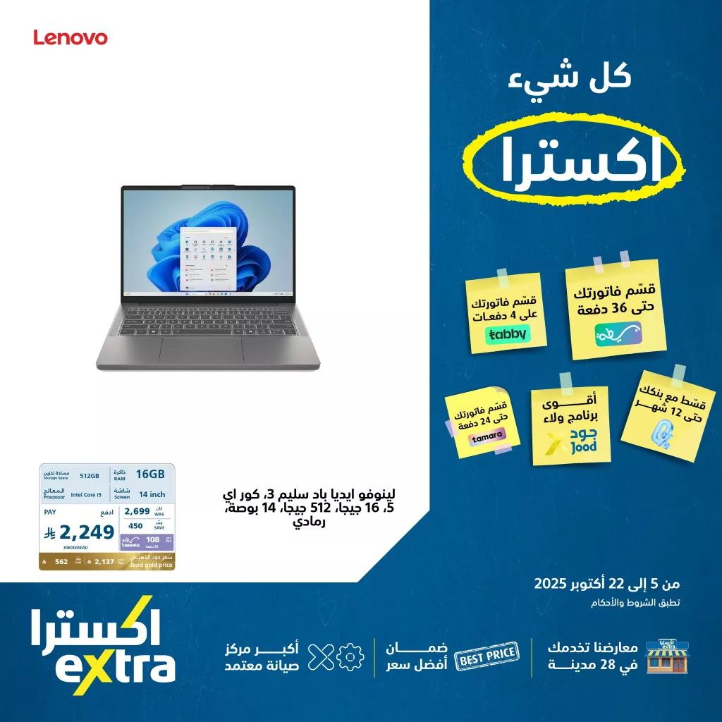 عروض اكسترا السعودية تقدم مجموعة من أجهزة اللابتوب الحديثة منها اجهزة لينوفو بمواصفات متنوعة منها ذاكرة رام عالية وسعة تخزين ممتازة وشاشة عالية الدقة مع خيارات التقسيط المريحة على عدة دفعات خليكو معانا علي موقعكم عروض توداي عشان يصلكم كل جديد عن عروض السعودية