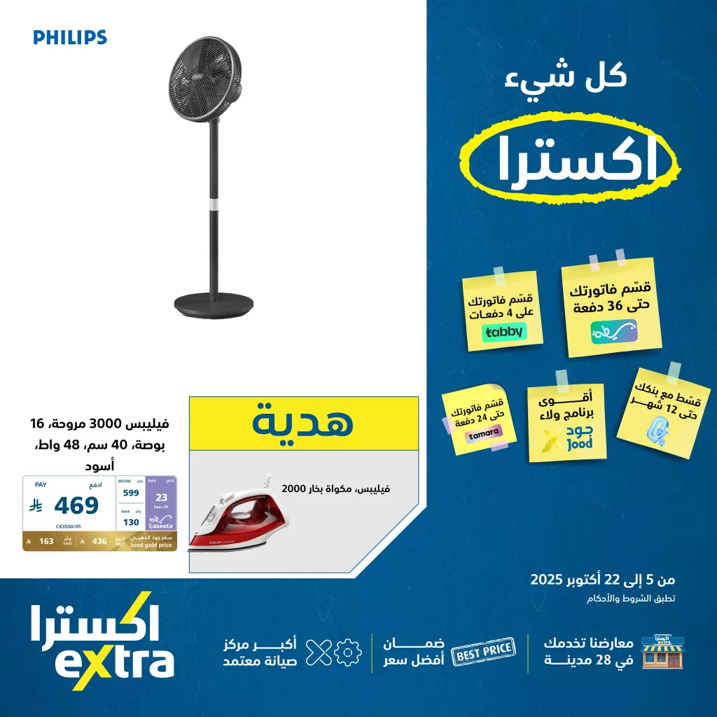 عروض اكسترا السعودية الجمعة 10 اكتوبر 2025 تقدم مجموعة مختارة من أجهزة فيليبس المنزلية التي تشمل المروحة الكهربائية والخلاط المزود بتقنية متقدمة لتحضير العصائر ويتميز العرض بمنح هدية مع كل منتج حيث يحصل العميل عند شراء المروحة على مكواة بخار وعند الحصول على الخلاط يتم تقديم ماكينة تحضير القهوة كهديه