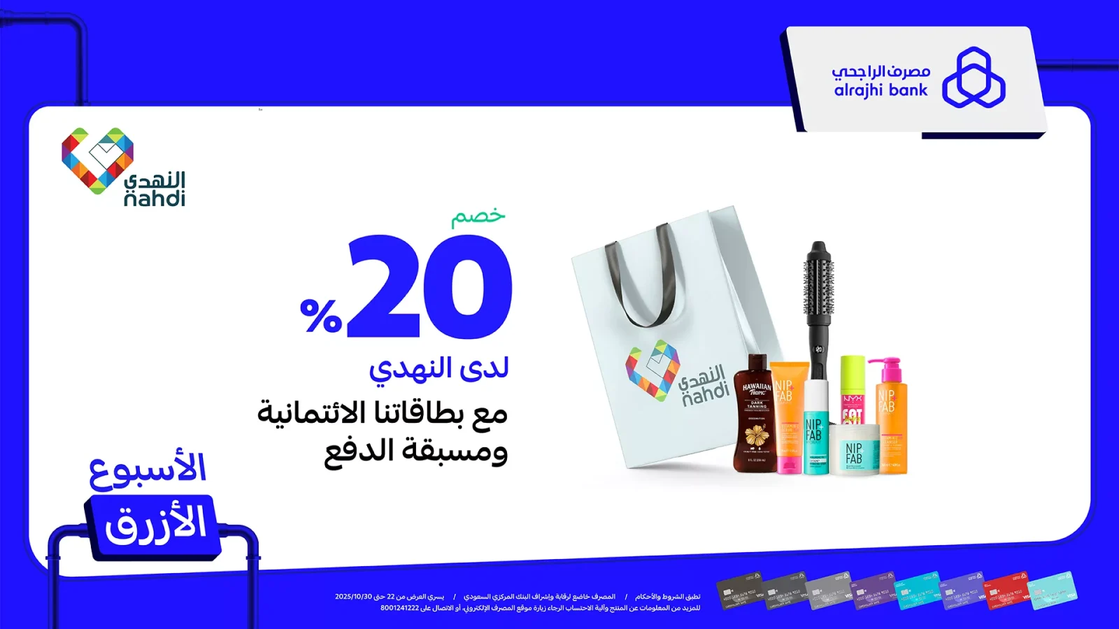 عروض الاسبوع الازرق خصم 20% من مصرف الراجحي و النهدي حتى 30 اكتوبر 2025 عند استخدام بطاقات مصرف الراجحي