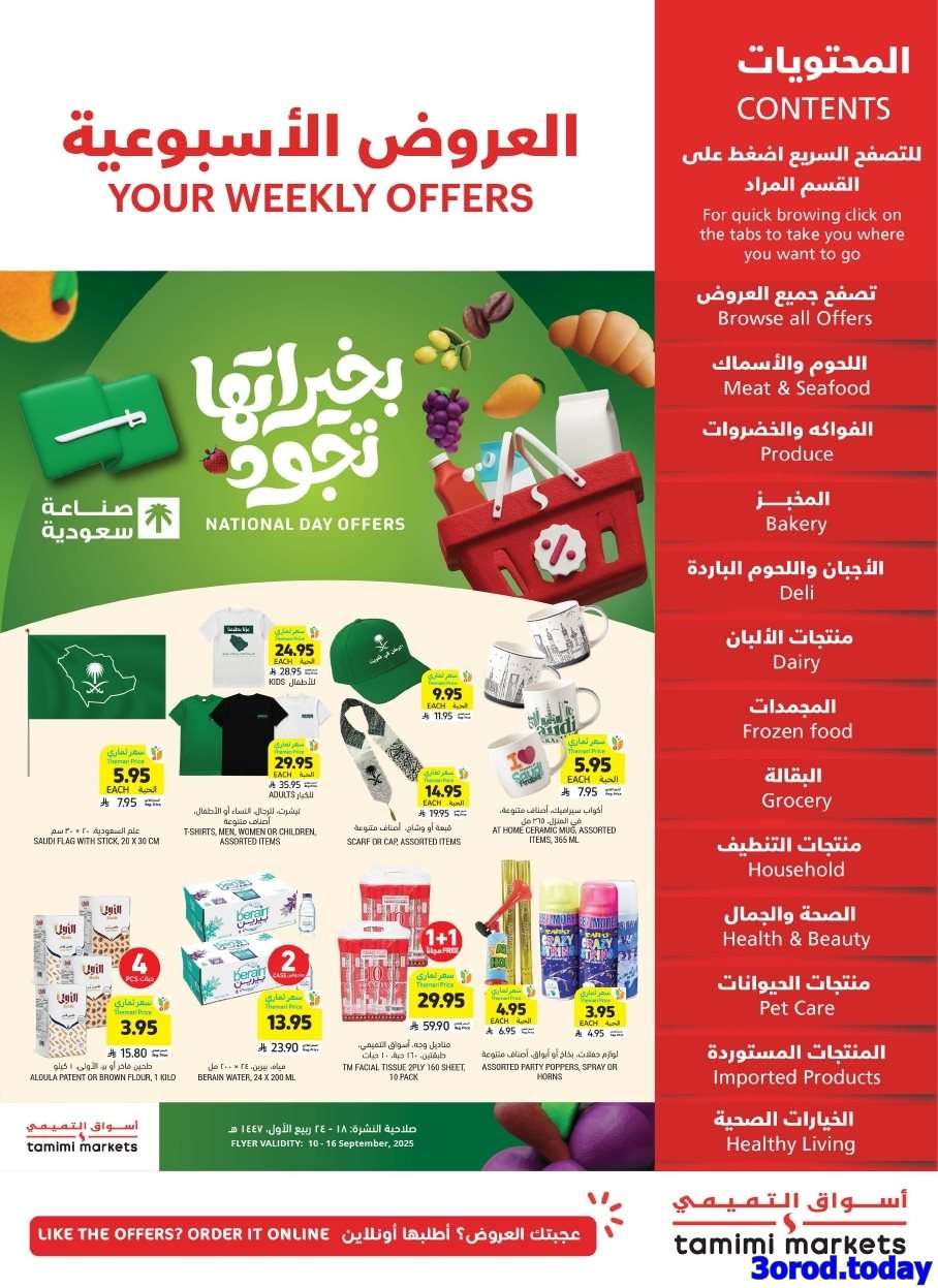 عروض التميمي الأسبوعية الأربعاء 10 سبتمبر 2025 تحتوي على الغسالات والمكانس الكهربائية الذكية ومحضرات الطعام وأجهزة الميكروويف ثم تستمر بالتخفيضات على لحم العجل الطازج والروبيان والخيار والطماطم الكرزية والبطيخ الأحمر والفواكه المجففة تابعونا لمعرفة كل جديد عن عروض اليوم الوطني 2025 علي موقعكم عروض توداي