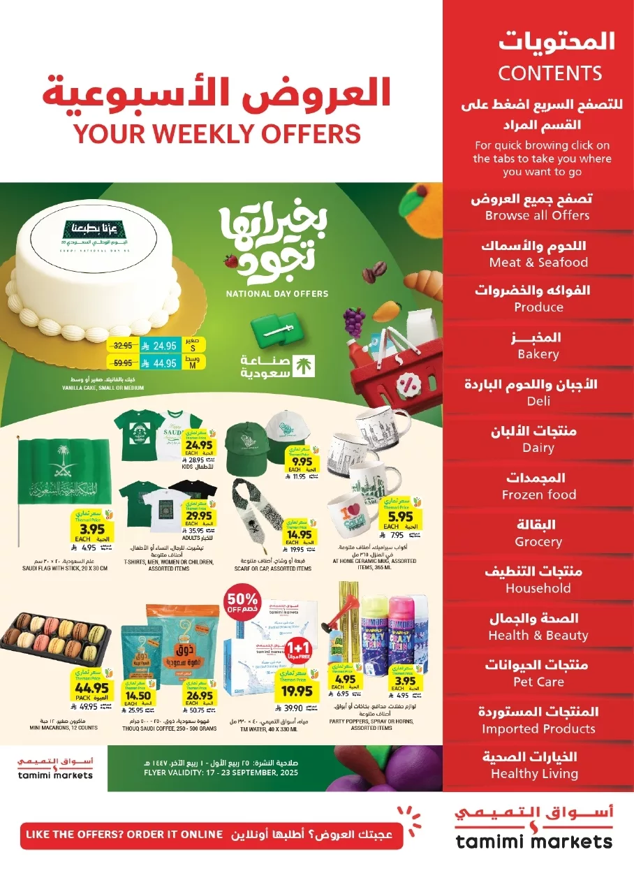 عروض التميمي الأسبوعية الأربعاء 17-9-2025 تقدم تخفيضات على الدواجن الكاملة المبردة ولحم البقر المستورد والسمك السلمون الطازج بجانب الخضروات كالطماطم الكرزية والباذنجان والبروكلي والفواكه مثل الموز والعنب والرمان كما تشمل العروض أسعارًا مميزة على أجهزة الميكروويف وأجهزة تحضير القهوة والمكانس الكهربائية